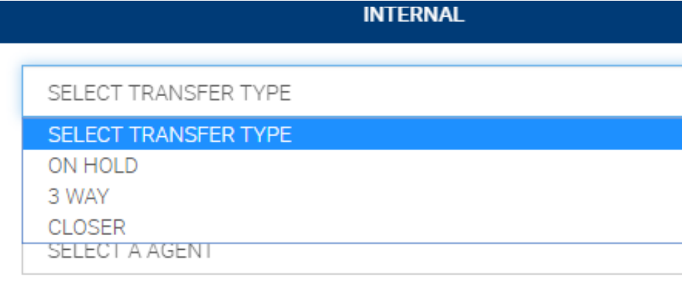 (2) Once selected, a transfer box will appear. You can select to do an ‘Internal transfer’ or ‘External transfer’. Internal would be for Agent to Agent transfer and external will be Agent to Number.